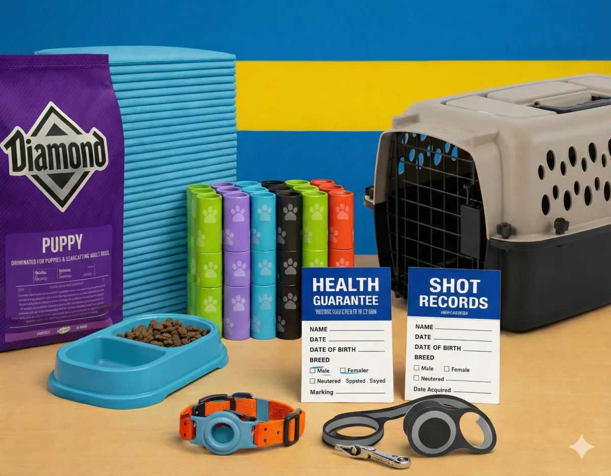 We coordinate pickup or delivery and send your puppy home with the Puppy Success Bundle for a smooth first month together.